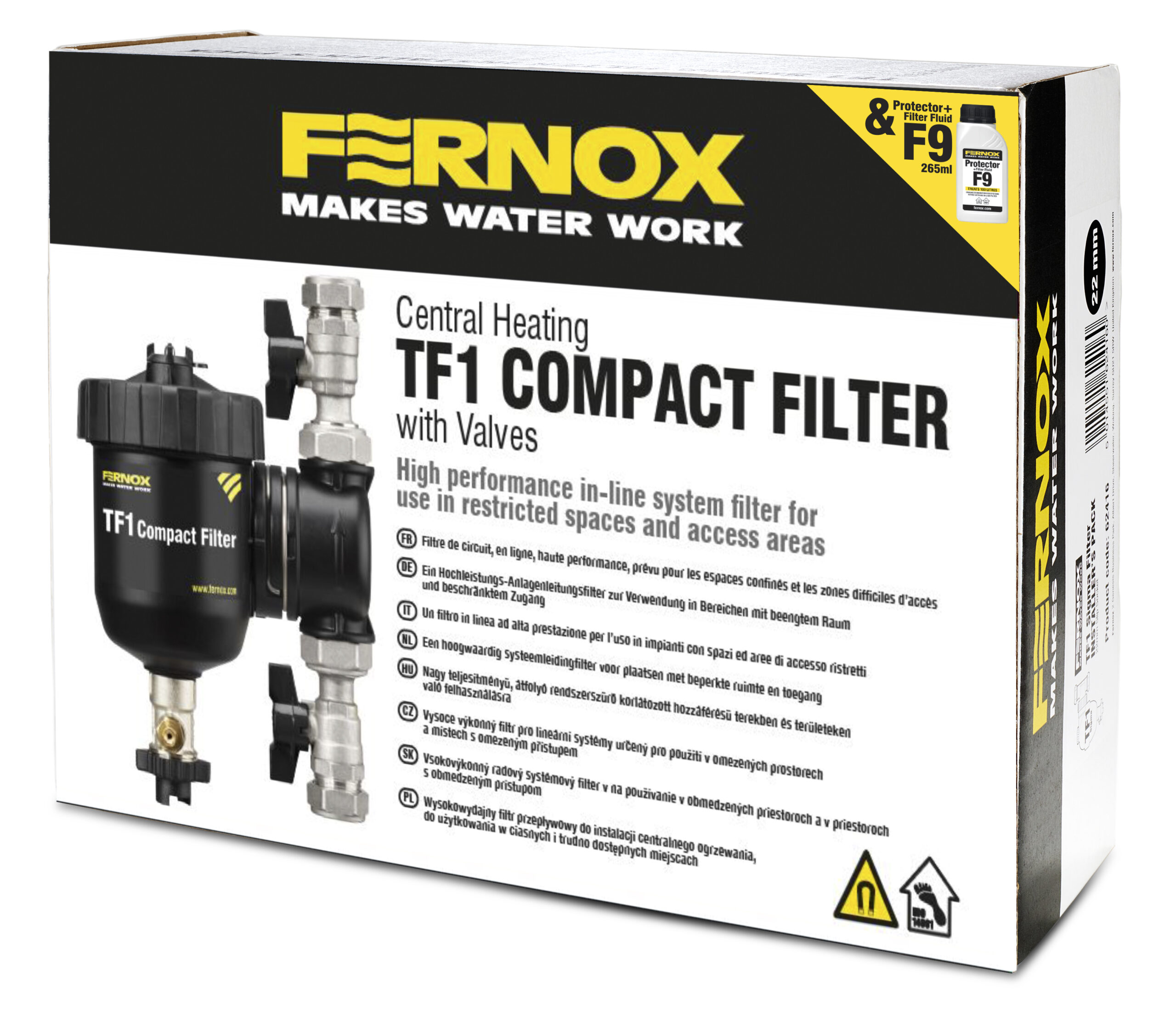 Ett högpresterande magnetiskt inline-systemfilter, TF1 Compact Filter är idealiskt för små och begränsade utrymmen. Detta enkla att installera kompositplastfilter kan monteras på vertikala och horisontella rörledningar i flera riktningar. Dess design möjliggör fångst av både magnetiska och icke-magnetiska föroreningar genom att använda hydrocyklonisk verkan och särskilt konstruerade magnetaggregat för att samla och hålla kvar föroreningar i filtret innan säker borttagning. Snabb och smidig rengöring via avtappningsventilen på mindre än 2 minuter – inget behov av att demontera enheten. Levereras med en förbättrad inhibitorprodukt, Protector+ Filter Fluid F9 265 ml, som innehåller ett dispergeringsmedel för att maximera filtereffektiviteten vid uppsamling av föroreningar. Den kompletterande rollen för kemikalien och filtret ger det ultimata skyddet för pannan och systemet.